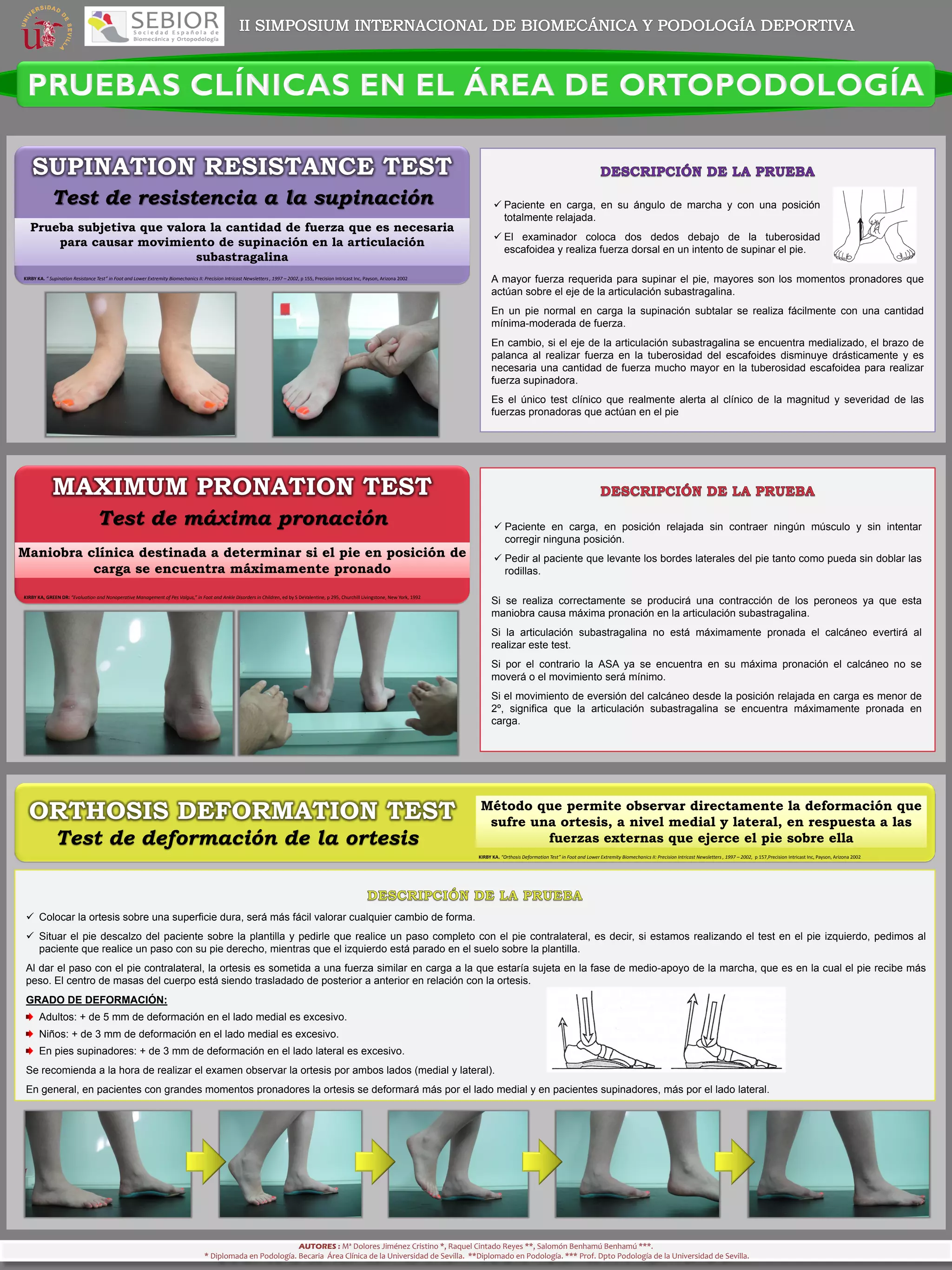 Este documento describe tres pruebas clínicas para evaluar el pie: 1) La prueba de resistencia a la supinación mide la fuerza necesaria para supinar el pie, lo que indica la magnitud de los momentos pronadores; 2) La prueba de máxima pronación determina si el pie se encuentra totalmente pronado bajo carga al medir la eversión del calcáneo; 3) La prueba de deformación de la ortesis observa cómo se deforma la ortesis bajo carga para indicar las fuerzas pronadoras o supinadoras.