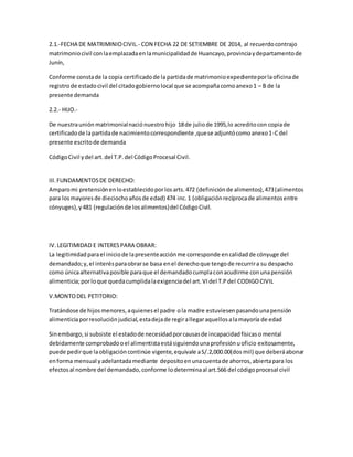 La demandante Luz Estrella Tovar Gutiérrez presenta una demanda acumulativa de divorcio por causales consecuentes, liquidación de sociedad de gananciales, custodia y tenencia y fijación de pensión alimenticia contra su esposo Félix Tomás Ríos Calderón. Solicita el divorcio debido a causales como adulterio, violencia psicológica e injuria grave, además de la liquidación de bienes y una pensión alimenticia de S/. 2,000 mensuales a favor de su hijo. Adjunta documentos que acredit