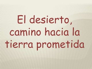 El documento describe la experiencia del pueblo de Israel en el desierto camino a la Tierra Prometida. Israel pasó 40 años en el desierto, donde Dios los probó y purificó a través de dificultades. A pesar de la desconfianza del pueblo, Dios cumplió su promesa de darles una tierra que fluye leche y miel. Para los cristianos, el desierto simboliza el peregrinaje en la tierra hacia la verdadera patria celestial.