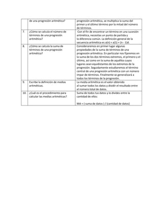 Este documento presenta las actividades realizadas por un grupo de estudiantes sobre sucesiones, progresiones aritméticas y medias aritméticas. Incluye un cuestionario, ejemplos, ejercicios y un mapa conceptual. El grupo resolvió problemas sobre diferentes tipos de sucesiones, cálculo de términos, sumas y definiciones relacionadas con progresiones aritméticas y medias aritméticas. Su promedio en las actividades fue de 9 sobre 10.