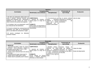 Este documento presenta una secuencia didáctica de 18 horas para enseñar inglés en el tercer semestre. La secuencia se centra en los auxiliares modales, tiempos pasado simple y pasado progresivo, con un tema integrador de alcoholismo. Incluye intenciones formativas, contenidos, actividades de aprendizaje y evaluación. Las actividades involucran explicaciones, presentaciones, lecturas, discusiones y ejercicios en pares y equipos para practicar los puntos gramaticales.