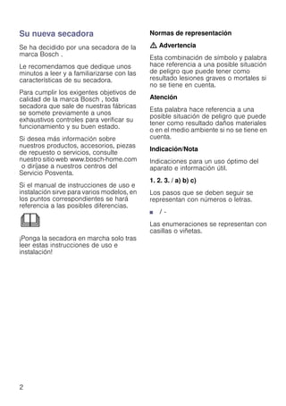 Este documento proporciona instrucciones para el uso y montaje de una secadora. Incluye secciones sobre instrucciones de seguridad, instalación, conexión, programas y manejo de la secadora. Advierte sobre posibles peligros y daños si la secadora no se usa correctamente y ofrece consejos para su limpieza y mantenimiento.