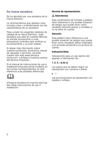 Este documento proporciona instrucciones para el uso y mantenimiento de una secadora Siemens. Explica cómo encender la secadora, seleccionar un programa, cargar la ropa, iniciar el programa y apagar la secadora una vez finalizado. También incluye consejos de seguridad, limpieza e información técnica sobre la secadora.