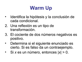 El documento habla sobre el razonamiento deductivo y cómo usar las leyes de "Detachment" y silogismos para verificar conjeturas. Explica que el razonamiento deductivo usa lógica para llegar a conclusiones a partir de datos, definiciones y propiedades. Luego da ejemplos de cómo aplicar estas leyes lógicas para determinar si varias conjeturas son válidas o no.
