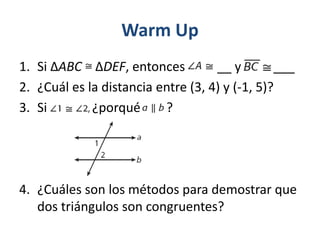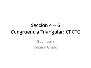 Este documento trata sobre la congruencia triangular y el uso del teorema CPCTC (partes correspondientes de triángulos congruentes son congruentes). Explica que CPCTC puede usarse como justificación una vez que se ha demostrado que dos triángulos son congruentes. Luego presenta dos ejemplos de cómo usar CPCTC para encontrar distancias desconocidas en figuras geométricas. Finalmente, asigna ejercicios de práctica relacionados con el tema.