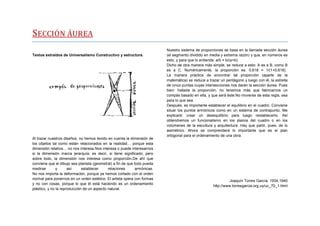 El documento habla sobre la sección áurea y su uso en el diseño. Explica que la sección áurea (también conocida como proporción divina) es una proporción matemática donde una línea se divide en partes desiguales de tal forma que la relación entre la parte mayor y el todo es igual a la relación entre la parte menor y la parte mayor. También describe cómo trazar un pentágono y una estrella de cinco puntas para encontrar gráficamente esta proporción y cómo usarla en un compás para crear diseños equilibrados y armónicos bas