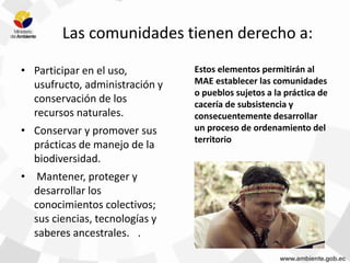 El documento proporciona lineamientos para la elaboración de planes de manejo de cacería de subsistencia y biocomercio. Establece que las comunidades tienen derecho a participar en el uso y conservación de los recursos naturales y mantener sus conocimientos ancestrales. También describe las responsabilidades del MAE y las comunidades en la elaboración de planes de manejo de cacería de subsistencia, e incluye lineamientos para planes de manejo de biocomercio como la identificación de áreas de recolección, el diagnóstico de recursos,