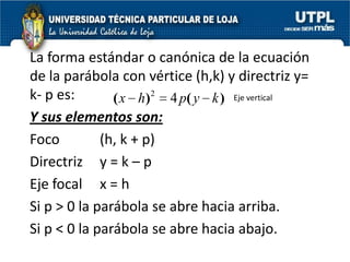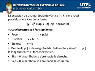 El documento aborda las secciones cónicas en matemáticas, incluyendo definiciones y características de la circunferencia, parábola, elipse e hipérbola. Se presentan sus ecuaciones canónicas y la relación entre sus elementos, como focos, vértices y ejes. También se incluye la metodología para resolver problemas y ejercicios aplicados a cada tipo de sección cónica.