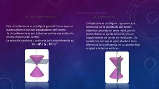 Este documento describe las secciones cónicas, que son figuras geométricas que resultan de cortar un cono por un plano. Las principales secciones cónicas son la circunferencia, la elipse, la hipérbola y la parábola. Cada una tiene propiedades únicas como su forma y ecuaciones matemáticas que las definen.
