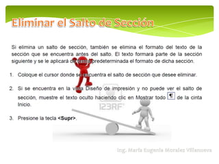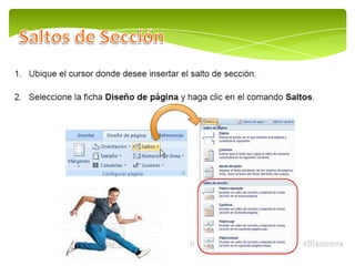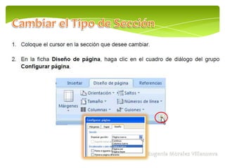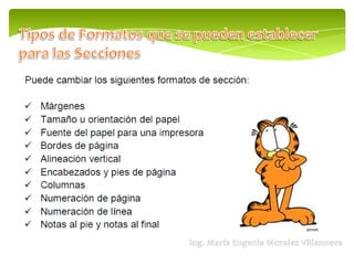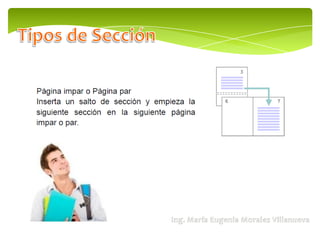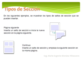 El documento habla sobre Microsoft Word 2010 y sus funciones como procesador de texto. Explica que una sección permite establecer opciones de formato de página como numeración de líneas, número de columnas y encabezados/pies de página. Menciona dos tipos de secciones comunes: una con formato de una columna y otra con formato de dos columnas.