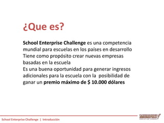 El documento proporciona información sobre el School Enterprise Challenge, una competencia mundial para escuelas en países en desarrollo. Los estudiantes forman equipos para iniciar una empresa escolar, presentan un plan de negocios, ponen en marcha la empresa, y comparten actualizaciones a través de blogs para tener la oportunidad de ganar premios de hasta $10,000 dólares.