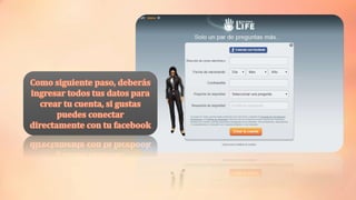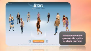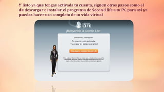 Este documento explica cómo unirse al mundo virtual de Second Life en 3 pasos: 1) Buscar Second Life en línea y seleccionar la opción para acceder, 2) Crear un nombre creativo para tu avatar, y 3) Instalar el programa en tu PC para crear tu imagen y lugares favoritos.