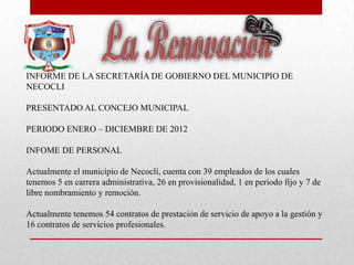 Este informe resume la gestión de la Secretaría de Gobierno del municipio de Necoclí durante el periodo de enero a diciembre de 2012. Actualmente el municipio cuenta con 39 empleados, de los cuales 5 tienen carrera administrativa, 26 son provisionales, 1 es de periodo fijo y 7 son de libre nombramiento. Se han respondido 22 tutelas de las cuales se ganaron 17 y se recibieron y respondieron 26 derechos de petición. Además, se realizaron dos días de gobierno en corregimientos para descentralizar la administra
