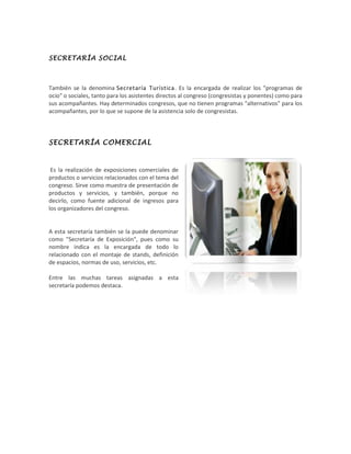 La Secretaría Social se encarga de organizar los programas de ocio y sociales tanto para los congresistas y ponentes como para sus acompañantes en los congresos. La Secretaría Comercial se encarga de la realización de exposiciones comerciales de productos y servicios relacionados con el tema del congreso, sirviendo como muestra y fuente adicional de ingresos para los organizadores, además de todo lo relacionado con el montaje de stands y definir espacios y normas de uso.