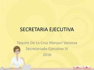 El documento describe el papel crucial de la secretaria ejecutiva en las empresas, destacando la importancia de su perfil, funciones, misión y cualidades personales. Se enfatiza la capacidad de apoyo logístico y la necesidad de mantener la discreción y el orden en sus tareas. Además, se subraya la importancia de las relaciones interpersonales y el respeto al código deontológico en su profesión.
