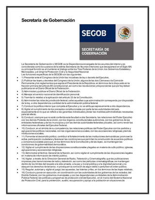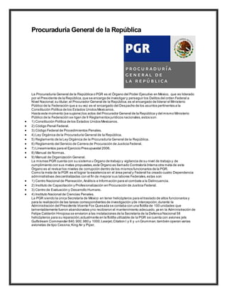 La Procuraduría General de la República (PGR) es el órgano del Poder Ejecutivo mexicano encargado de investigar y perseguir delitos federales a nivel nacional. La PGR cuenta con cuatro dependencias administrativas descentralizadas y helicópteros para transporte y tareas de investigación. La Secretaría de Gobernación se encarga de los asuntos internos del país y mantiene el diálogo entre los poderes del gobierno, mientras que la Secretaría de Relaciones Exteriores dirige las relaciones internacionales de México