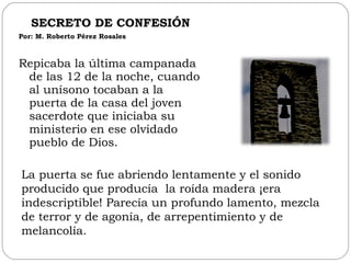 Un sacerdote recibe la confesión de una mujer misteriosa en medio de la noche. Ella relata cómo su familia esclavizó e hizo masacrar a los indígenas locales para construir una capilla, lo que la llevó a jurar colocar un crucifijo ensangrentado en el altar para unir a todos bajo Dios. Al terminar su confesión, la mujer desaparece, dejando solo el crucifijo. El sacerdote queda impactado por el encuentro sobrenatural.