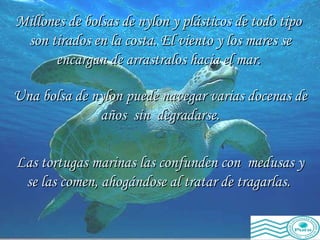 El documento habla sobre los efectos negativos que tiene la basura dejada por los humanos en las playas y mares. Millones de bolsas y plásticos son tirados en las costas y terminan en el mar, donde tortugas, delfines y aves como el albatros los confunden con comida y mueren ahogados al tratar de tragarlos. Pequeños pedazos de plástico fueron encontrados en el estómago de crías de albatros, alimentadas por sus padres que no pudieron distinguir la basura. Se enfatiza