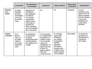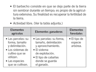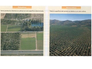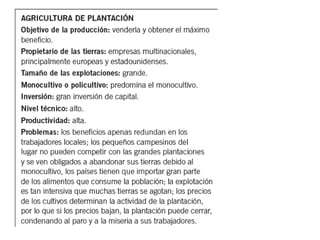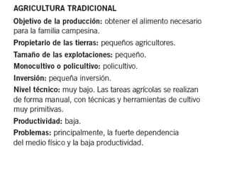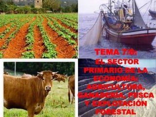 El documento resume los principales aspectos del sector primario de la economía. Explica que incluye actividades como la agricultura, ganadería, pesca y explotación forestal que proporcionan productos directamente de la naturaleza. Describe los diferentes tipos de agricultura, ganadería y pesca que existen en países desarrollados y en desarrollo, así como los factores que influyen en cada actividad y los paisajes agrarios que se generan.