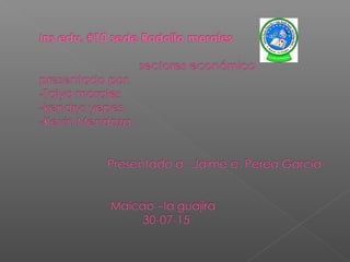 Este documento describe los principales sectores de la economía, incluyendo el sector agropecuario, minero, manufacturero, eléctrico, de construcción, comercial, de comunicación y transporte, y financiero. Cada sector se define brevemente, con el sector agropecuario dividido en subsectores agrícola, pecuario y apícola, el sector minero dividido en minería metálica, no metálica y piedras, y el sector manufacturero describiendo la transformación de materias primas.