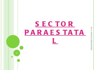 El documento habla sobre el sector paraestatal en México. Explica que el sector paraestatal incluye organismos descentralizados, empresas de participación estatal, sociedades nacionales de crédito, organizaciones auxiliares nacionales de crédito, instituciones nacionales de seguros y fideicomisos. Estas entidades cooperan con el Estado sin formar parte de la administración pública.