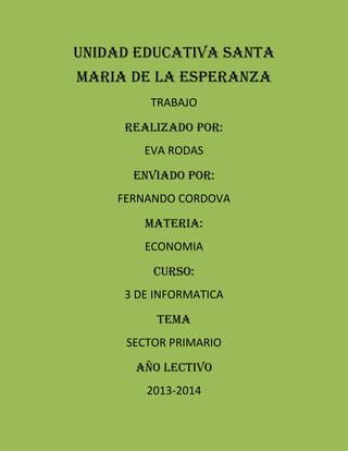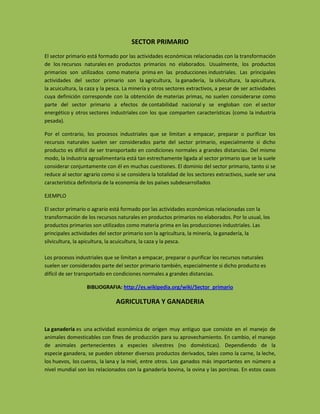 El documento describe las principales actividades del sector primario, incluyendo la agricultura, ganadería, silvicultura, apicultura, acuicultura, caza, pesca y minería. Explica que el sector primario se compone de la transformación de recursos naturales en productos sin procesar, los cuales se usan como materia prima en la industria. También cubre procesos industriales limitados de empaque y purificación de recursos naturales que se consideran parte del sector primario.