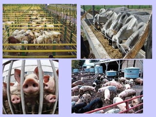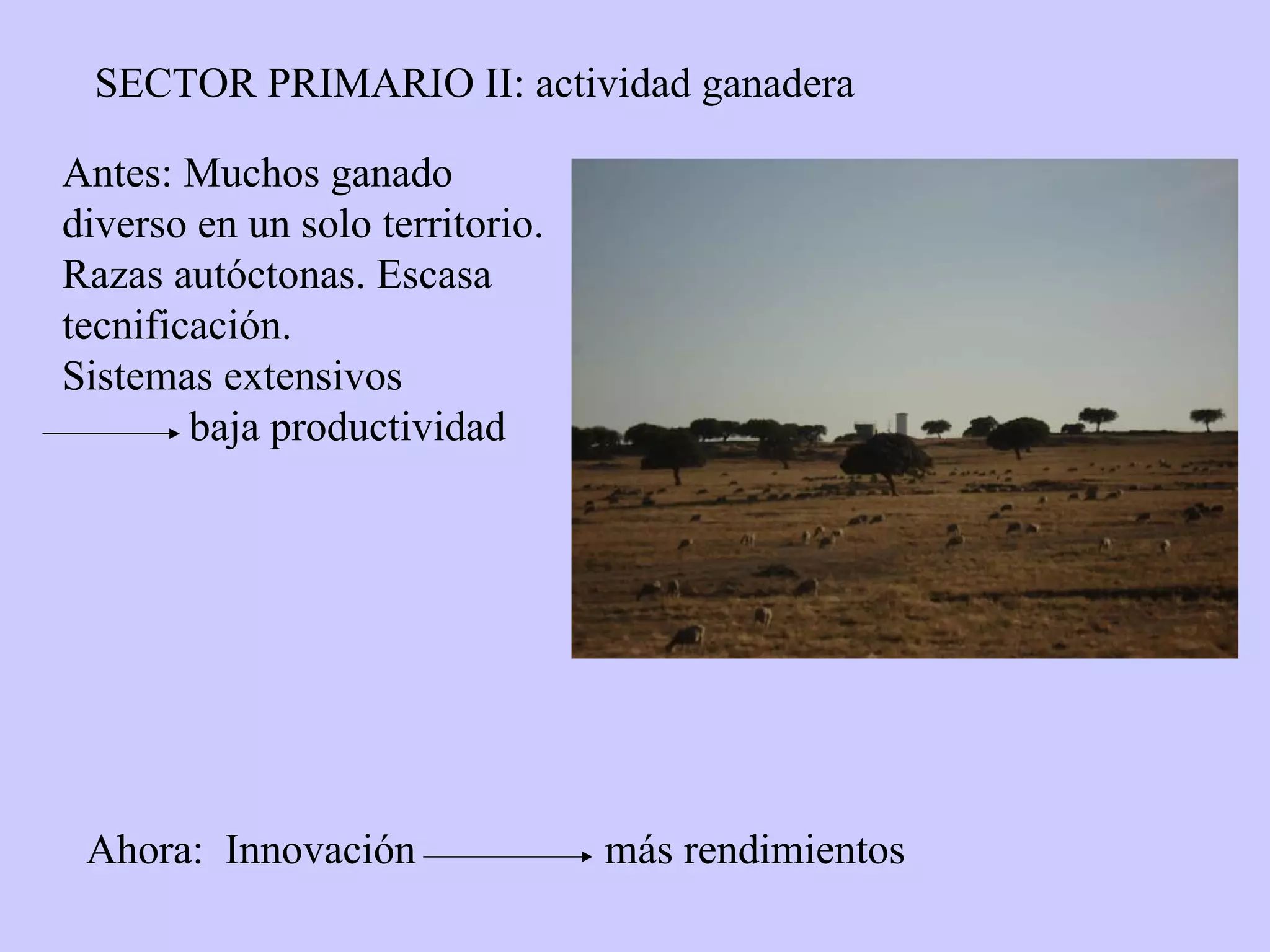 El documento describe las transformaciones que ha experimentado el sector primario en España, especialmente la ganadería. Antes se caracterizaba por sistemas extensivos de baja productividad con razas autóctonas, mientras que ahora hay más innovación, especialización y tecnificación, resultando en mayores rendimientos. La ganadería intensiva ha reemplazado en gran medida a la extensiva y se concentra en el noreste y litoral mediterráneo. También se ha mecanizado la agricultura, liberando tiempo para otras actividades y mejorando la producción y cal