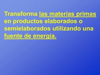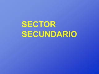 El documento describe las diferentes fuentes de energía y tipos de materias primas utilizadas en el sector secundario. Explica que el sector secundario transforma las materias primas en productos elaborados mediante una fuente de energía. A continuación, detalla los distintos tipos de materias primas como minerales, rocas, materias orgánicas y químicas, y las principales fuentes de energía como el carbón, petróleo, gas, hidroelectricidad, energía nuclear, solar, eólica y biomasa.