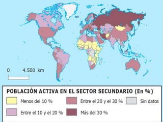 El documento proporciona una introducción al sector secundario, incluyendo la industria, la minería y la construcción. Describe las fuentes de energía renovables y no renovables, y los tipos de industrias que existen. También analiza las políticas energéticas y la evolución de la actividad industrial, así como los espacios y paisajes industriales y las principales regiones industriales.