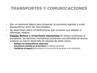 El documento describe los sistemas de transporte y comunicaciones en España. Señala que la red vial y ferroviaria tiene un diseño radial con centro en Madrid, lo que ha creado desequilibrios territoriales. Explica que el Estado controla las infraestructuras principales mientras que las comunidades autónomas gestionan las redes regionales. También destaca los esfuerzos por mejorar la integración de España en la red de transporte europea, especialmente a través de líneas de alta velocidad.