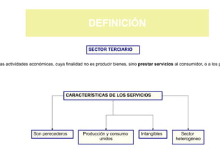 Este documento define el sector terciario y las actividades de servicios. Explica que su finalidad no es producir bienes sino prestar servicios. Describe algunas características de los servicios como su perecederidad y la unión entre producción y consumo. Además, clasifica los servicios según la propiedad del prestador entre públicos y privados y según su aparición histórica.