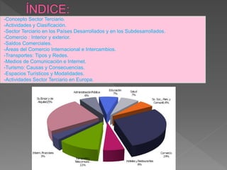El documento describe el sector terciario y sus principales actividades como el comercio, transporte, turismo y comunicaciones. Explica que en los países desarrollados estos servicios están muy extendidos y la mayoría de personas tienen acceso a los básicos como sanidad y educación, mientras que en los subdesarrollados son insuficientes y faltan los servicios básicos. También analiza las características del comercio internacional y las principales áreas comerciales, así como el impacto del turismo y las actividades del sector terciario en Europa.