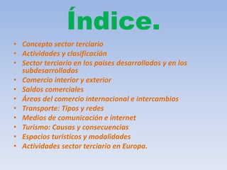 El documento presenta una introducción al sector terciario o de servicios, describiendo sus principales actividades como el transporte, comercio, turismo, entre otros. Explica las diferencias en el desarrollo del sector terciario entre países desarrollados y subdesarrollados. Incluye también secciones sobre el comercio interior y exterior, medios de transporte y comunicación, y turismo.