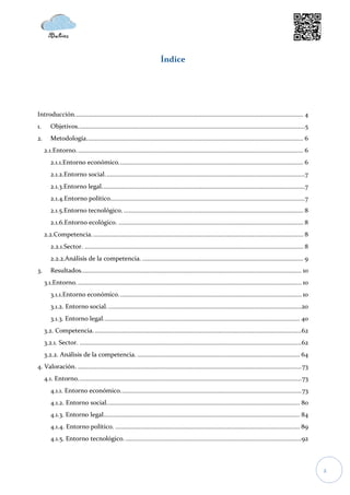 Este documento presenta los resultados de un estudio de mercado realizado para una nueva empresa. Analiza el entorno económico, social, legal y competitivo en España y la región. En cuanto al entorno económico, estudia indicadores como el PIB, gastos de los hogares, empleo y paro. Respecto a la competencia, analiza el sector y las principales empresas similares en la zona. El estudio proporciona información valiosa para tomar decisiones sobre el lanzamiento del nuevo negocio.