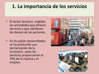 El documento describe los principales servicios que componen el sector terciario de la economía. Explica que los servicios incluyen transporte, comercio, turismo y servicios públicos y privados. Además, analiza los tipos de transporte, comercio interior y exterior, y los beneficios y problemas del turismo.
