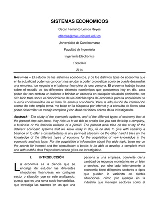 El documento resume los principales sistemas económicos, incluyendo los sectores primario, secundario, terciario y cuaternario. También distingue entre bienes, que son objetos materiales, y servicios, que son actividades intangibles. Además, describe las cuatro etapas del ciclo económico: recuperación, auge, recesión y crisis.