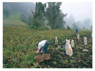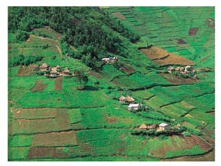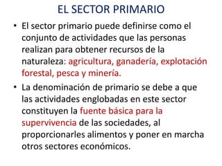 Este documento describe el sector primario y las principales actividades que lo componen. El sector primario incluye la agricultura, la ganadería, la silvicultura, la pesca y la minería, cuyo objetivo es obtener recursos de la naturaleza. Se explican los diferentes tipos de agricultura y ganadería en países desarrollados y subdesarrollados, así como los factores que influyen en el aprovechamiento agrícola. También se describe la pesca según la profundidad y ubicación.