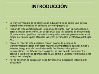 Este documento discute la importancia de adoptar un enfoque basado en competencias en la educación. Explica que la sociedad actual demanda que los estudiantes estén mejor preparados para enfrentar los desafíos del siglo 21. También identifica algunos retos del sistema educativo actual como la desconexión de la realidad y el énfasis en la memorización. Luego, argumenta que los docentes deben cambiar su enfoque de uno conductista a uno constructivista para facilitar aprendizajes significativos. Finalmente, enumera diez competencias clave que los