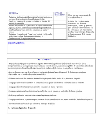 Este documento presenta la planeación didáctica para la unidad sobre la estructura de la materia desde el modelo cinético de partículas para el cuarto bimestre de Ciencias II con énfasis en Física. La unidad cubrirá las propiedades de la materia, la presión, el principio de Pascal, y los cambios de estado desde la perspectiva del modelo de partículas. Las actividades propuestas incluyen experimentos sobre la presión en líquidos, la relación entre fuerza y presión, y la demostración del principio de Pas