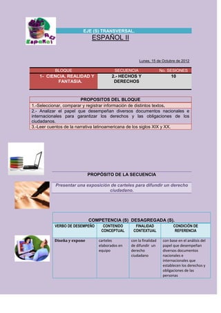 Este documento presenta la secuencia del bloque 1 del español II sobre hechos y derechos. El propósito de la secuencia es presentar una exposición de carteles para difundir un derecho ciudadano. Los estudiantes analizarán documentos nacionales e internacionales que establecen los derechos y deberes de los ciudadanos para diseñar y exponer carteles sobre un derecho.
