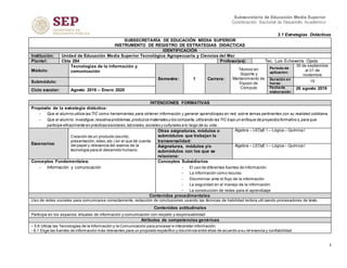 Este documento presenta una estrategia didáctica para enseñar el módulo de Tecnologías de la Información y Comunicación a estudiantes de primer semestre de la carrera de Técnico en Soporte y Mantenimiento de Equipo de Cómputo. La estrategia incluye objetivos formativos, contenidos, actividades, recursos y evaluación. El propósito es que los estudiantes utilicen las TIC como herramientas de aprendizaje y que investiguen, resuelvan problemas y compartan materiales usando las TIC.