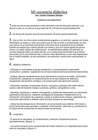 Este documento presenta una secuencia didáctica de dos semanas sobre la conservación del medio ambiente dirigida a niños de primaria. La secuencia incluye actividades prácticas como juegos de reciclaje y una excursión, así como videos e investigaciones en internet sobre temas como la contaminación, el agua y los animales en peligro. El objetivo es crear conciencia sobre la importancia de cuidar el planeta y fomentar comportamientos respetuosos con el medio ambiente.