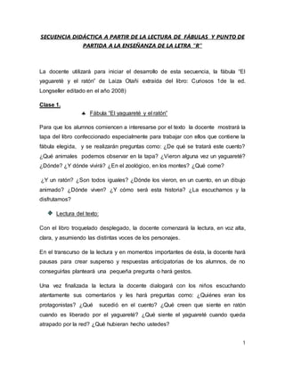 Este documento describe una secuencia didáctica de 3 clases para enseñar la letra "R" a través de la lectura y análisis de fábulas. En la primera clase, los estudiantes leen la fábula "El yaguareté y el ratón" y completan actividades sobre los personajes. En la segunda clase, leen "El cuervo y la zorra" y analizan la moraleja. En la tercera clase, los estudiantes identifican la letra R en los nombres de los animales, aprenden sobre sus sonidos y completan