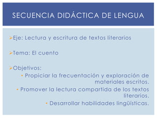Este documento presenta una secuencia didáctica para trabajar cuentos literarios en segundo grado. La secuencia consta de 5 tareas que incluyen presentar un cuento seleccionado, analizar sus elementos, generar un inicio y final alternativos, definir palabras del cuento y ilustrar y narrar escenas. El objetivo es desarrollar habilidades lingüísticas a través de la lectura y escritura de textos.