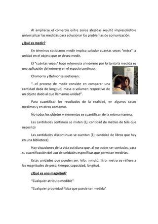 Este documento describe los conceptos fundamentales de la medición y cómo se pueden enseñar en el jardín de infantes. Explica que la medición implica comparar un objeto con una unidad, y que hay diferentes tipos de medición como longitud, peso y capacidad. También describe cómo los niños inicialmente miden de forma perceptiva y luego aprenden a medir de forma convencional a través de actividades que involucran comparación, desplazamiento de objetos y conservación.