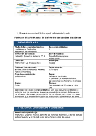 El documento propone el diseño de una secuencia didáctica para enseñar números decimales en quinto grado, utilizando recursos educativos digitales abiertos. Se sugiere que los docentes definan objetivos, competencias y contenidos antes de implementar actividades en base a un contexto sociocultural. La metodología incluye el uso de computadoras e internet para indagar sobre el tema y evaluar la comprensión a través de exposiciones grupales.