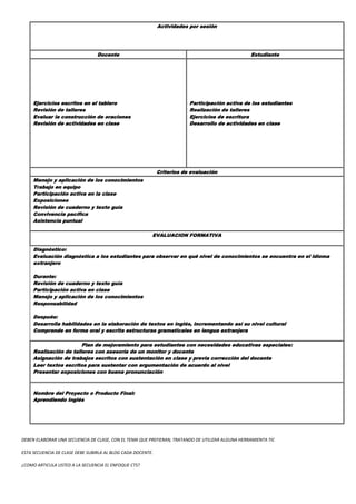 El documento presenta la secuencia didáctica de una docente para una clase de inglés de séptimo grado. La clase abordará temas como el presente simple, preguntas con DO y DOES, y los verbos LIKE y WANT durante 10 semanas. La docente utilizará estrategias como ejercicios escritos, lecturas, actividades lúdicas y recursos TIC. La evaluación será formativa y diagnóstica para mejorar el nivel de inglés de los estudiantes.