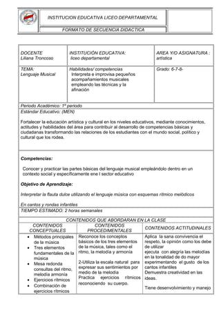 Este documento presenta la secuencia didáctica de una clase de lenguaje musical para grados 6-8. La docente Liliana Troncoso enseñará a interpretar la flauta dulce utilizando el lenguaje musical con esquemas rítmico melódicos en cantos y rondas infantiles. La clase de 2 horas semanales abordará conceptos, procedimientos y actitudes relacionados con los elementos fundamentales de la música como el ritmo, la melodía y la armonía. Se utilizarán estrategias como clases magistrales, ex