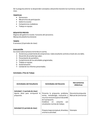 El documento presenta una secuencia didáctica sobre democracia y gobierno escolar para el grado noveno, enfocándose en la generación de un ambiente propicio para la participación ciudadana y el fortalecimiento de valores democráticos. Se detalla un plan de actividades y evaluación a lo largo de seis semanas, promoviendo la autonomía del pensamiento y el trabajo en equipo entre los estudiantes. Además, se describen diversos mecanismos de participación ciudadana y se fomenta la crítica activa de los estudiantes hacia el funcionamiento del gobierno escolar.