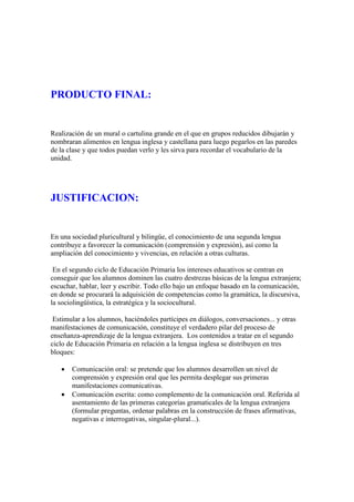 Este documento proporciona información sobre una unidad didáctica sobre alimentos en inglés para un curso de segundo ciclo de Educación Infantil. La unidad se centra en enseñar vocabulario de alimentos en inglés a través de actividades como dibujos, juegos y vídeos. La unidad también cubre objetivos relacionados con matemáticas, lengua y conocimiento del medio. Se describen las sesiones propuestas para la unidad, que incluyen ejercicios de vocabulario, sumas con ilustrac